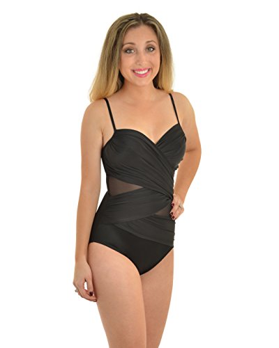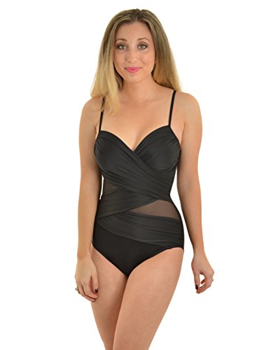 This black one piece bathing suit shows the perfect hint of skin through its peekaboo mesh cut outs. The wrap style ruching will help create a slimming silhouette and the underwire cups will help provide support.