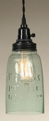 4½" diameter and 11¼" tall. Includes a half gallon Mason jar with no bottom. Use these for higher wattage bulbs such as 40 or 60 watts. Shown with our 40 watt vintage bulb, not included. With the open bottom and ventilation on the top, these provide plenty of light while keeping everything cool. Our pendant lamps include it all: 15½ foot cloth-covered lamp cord with switched socket, two finished ceiling hooks, two cord clamps for adjusting the height of the lamp, and easy-to-follow instructions.Feature