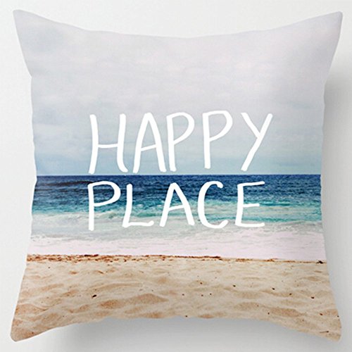 18*18 inches on size, decorate with refreshing pattern with words "Happy Place" on cover, 100% renewable material, No optical brightener has been used, Non-chlorine bleach.