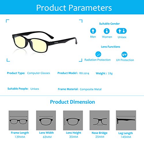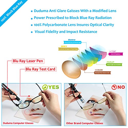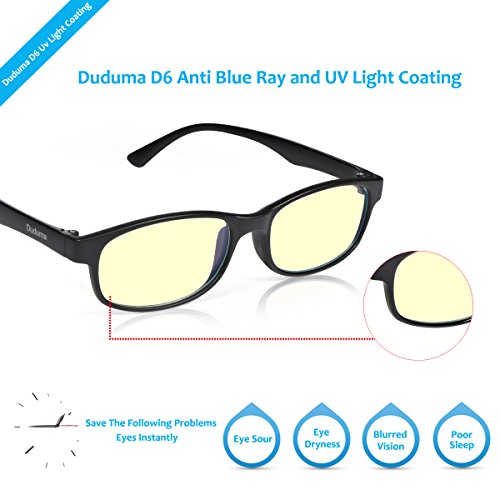 - Duduma D6 Anti Blue Ray and UV Light Coating: Duduma blue light blocking lenses are processed with anti-reflective coating and anti-glare treatment, eliminate reflections of light from the front and back surfaces of your lenses; absolutely block UV light under 400nm and absorb harmful blue rays from 400-500nm emitted by computer screens that is associated with harmful glare.