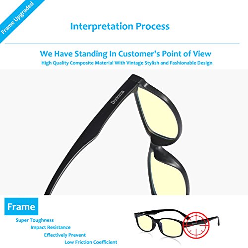 - Duduma Radiation Protection Lens Design: Strictly tested and analyzed with spectrometric experiments, Duduma anti glare galsses with a modified lens power prescribed to block blue ray radiation, give the most comfortable vision for computer screen watching like readers reading, gamer video gaming. 100% polycarbonate lens insures optical clarity, visual fidelity and impact resistance.