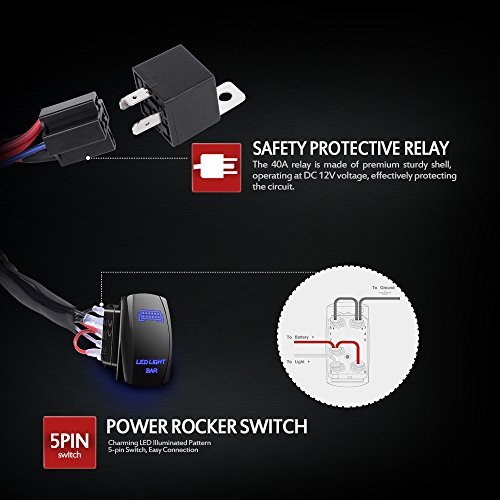 GREAT CONSTRUCTION: 40A Power Relay and Inline Blade Fuse for multiple safety protection.It is 2 lead that with 2 lights output connection,it can hook with 1 heavy duty off road led light bar above 180w and two small light bar.