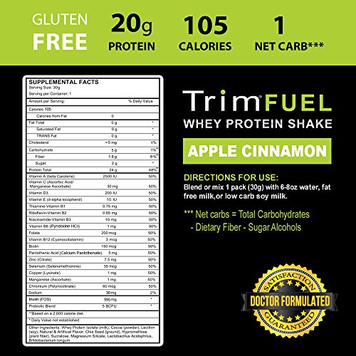 -. Feature : 3 Individual Packages of 1 Apple Cinnamon, 1 Chocolate and 1 Vanilla -Great tasting whey protein isolate is gluten free, low fat, low calorie, and low carb / Fortified with minerals, vitamins, amino acids, and antioxidants / Trim Fuel Protein has more protein and less carbs, fat and calories than other leading brands / Great for weight loss or general nutrition Blend or mix with 6-8 ounces of water, fat free milk, soy milk or almond milk / MADE IN THE USA