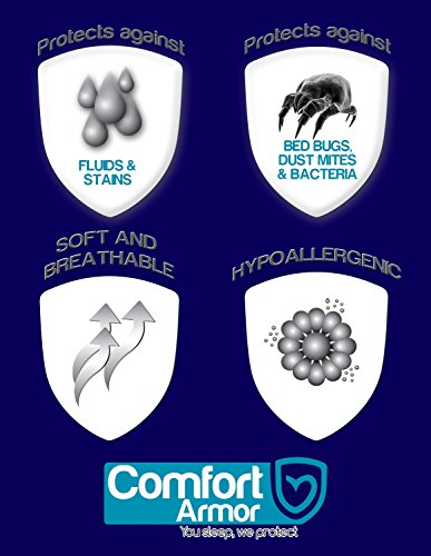 Feature : • PERFECT USE: Great for those with kids, pets, allergies, asthma, eczema or incontinence. / • PERFECT FIT: Fully elasticized fitted sheet style fits all mattress depths from 6" to 18". Superior quality, free from vinyl, pvc, phthalates. / • FEATURES: Soft, noiseless and breathable hypoallergenic cotton terry surface won't trap the heat with its airflow technology , while repeling the fluids. Will not change the feel of your mattress. / • PROTECTION: Protects against dust mites, fluids urine, perspiration, allergens and bacteria. 100% bed bug proof. comfort armor, you sleep, we protect. / • WARRANTY: 10 year warranty against manufacturing defects. Machine washable (see care instructions insert)