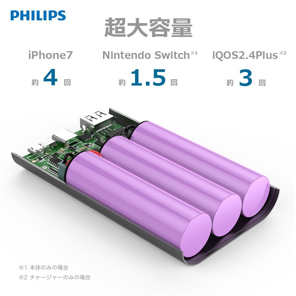 Large capacity batteries have capacity to charge iPhone 7 about 4 times, Nintendo Swich main body about 1.5 times, iQOS 2.4 Plus charger about 3 times.