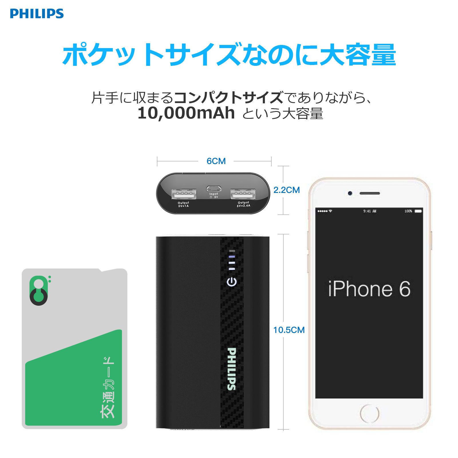 It realizes a compact design of 105 x 61 x 22 mm while mounting a large capacity battery of 10,000 mAh and a high output USB port.