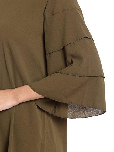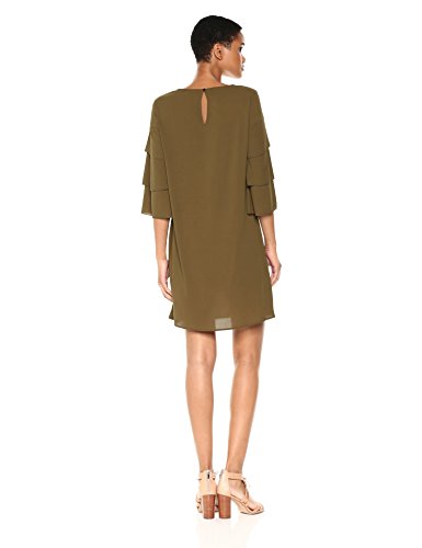 Woven knee length dress with ruffle tiered sleeves. Button and loop back closure.