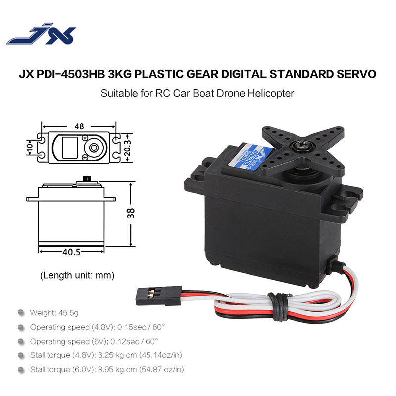 JX PDI-4503HB plastic gear digital standard servo is specially designed for RC car, boat, drone and helicopter. Small size and light weight is conducive to the flight/driving/sailing of RC models. Besides, its high quality dual ball bearing, large torque and high strength design will perfect for your RC models.