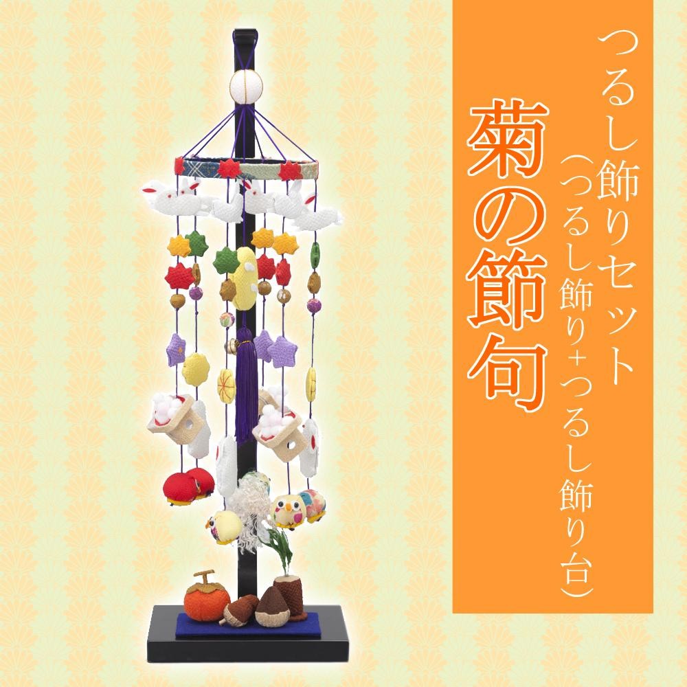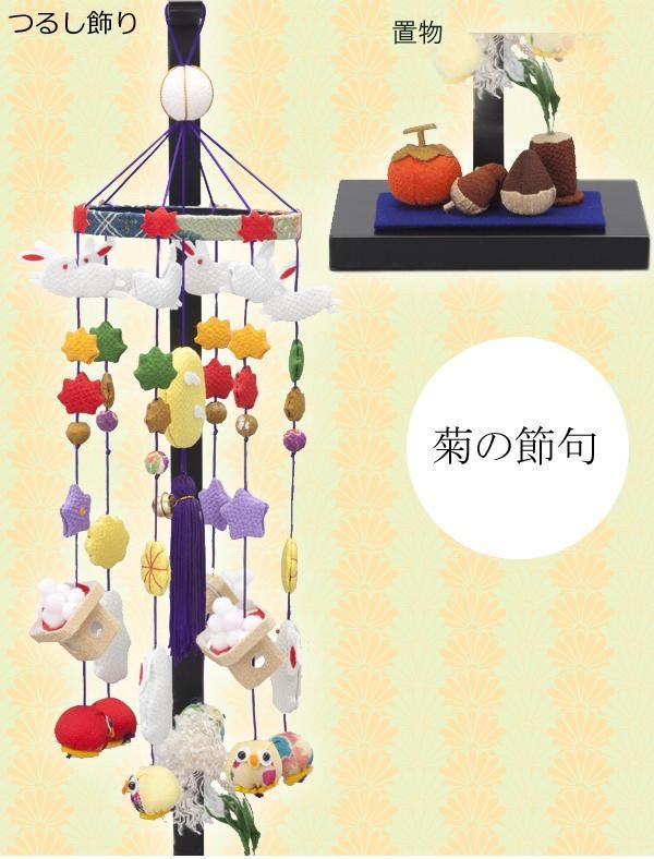 9月9日は重陽(ちょうよう)の節句(別名:菊の節句)といわれ、菊に長寿を祈る日。陽(奇数)が重なる日そして、奇数の中でも一番大きな数字という意味で重陽といわれています。現代では、縁起物を飾ったつるし飾りは、地域や時期に限定されることなくインテリアとして人気を集めています。 |