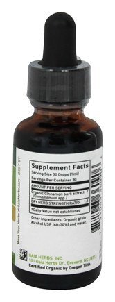 Suggested Use As a dietary supplement Take 30-40 drops of extract in a small amount of water 3 times daily between meals. - Or as directed by your healthcare professional. Supplement FactsServing Size: 30 Drops (1ml)Servings Per Container: 30Amount Per Serving% Daily Value***Extract Organic Cinnamon bark in organic grain Alcohol USP 60-70% and WaterMinimum Dry Herb Strength Ratio 1:3 Certified Organic by Oregon Tilth ***Percent Daily Values are based on a 2,000 calorie dietWarnings: Keep out of reach of children. As with all dietary supplements, consult your healthcare professional before use. See product label for more information. Not to be used during pregnancy or lactation. If you have a medical condition or take pharmaceutical drugs, please consult with your doctor before using this product. Keep away from children. Use only as directed on label.