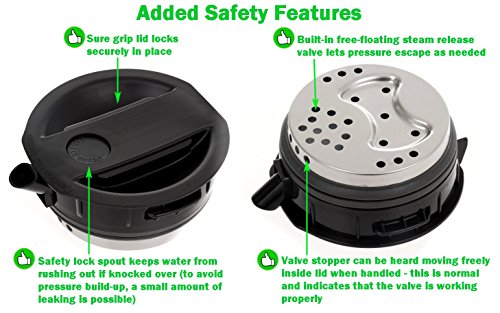 - Built-in safe lock spout button lets steam escape as needed plus only a small amount of water will spill if tipped or knocked over