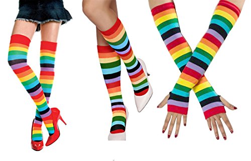 -. Feature : Great Material - 80% acrylic & 20% spandex, soft & comfy. / One Size Fits Most - socks and gloves are stretchable / Simple but fashionable design keeps you looking good. This rainbow fingerless long knit gloves socks stockings set are suitable for halloween costume, fun party, cosplay performance and show, get ones for highlight party and normal life. / Valued Pack- 1 pair of thigh high socks + 1 pair of knee high socks +1 pair of fingerless arm warmer gloves / 100% MONEY BACK GUARANTEE! Great gift ideal for Christams, New Year, Birthday, Thanksgiving Day and so on