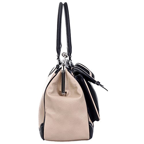 - Feature : **Official MG Collection® product made and sold exclusively by MyGift®**. Products sold by other sellers may vary. / The striking contrast of the beige and the black gives this vintage tote bag a bold look that is both classic and modern. / Below a clasp-style top closure lies a spacious and lined main compartment with 2 zippered pouches, 2 pocket-style organizers, and 1 large pocket for securing smaller valuables. / 2 padded handles and a detachable shoulder strap, you'll have plenty of options for carrying your satchel handbag. / Made of manmade material. Approximate Dimensions: Exterior - 12" H X 16" W X 6.5" D; Interior - 10.5" H X 14.5" W X 5.5" D; Handle - 7" drop; Shoulder Strap - 21" drop.
