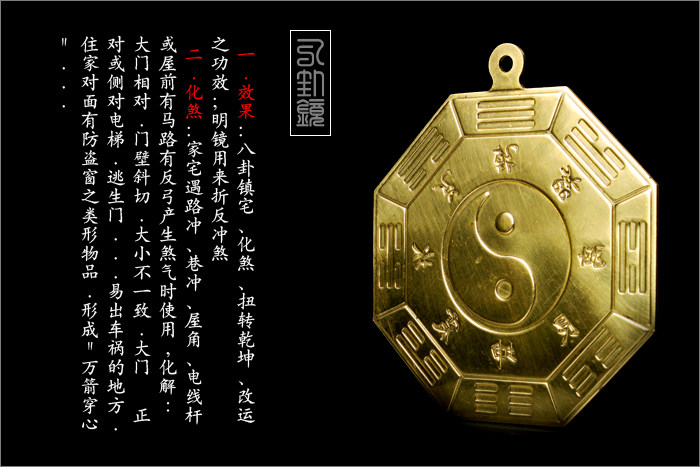 产品介绍: 【八卦镜的介绍】 八卦镜也叫太极八卦镜:在我国一直被称为风水吉祥物。据传,在距今七千年前的上古时代,伏羲氏观物取象,始作八卦。"以通神明之德,以类万物之情。" 《易·系辞传》说:"易有太极,是生两仪,两仪生四象,四象生八卦。"太极就是一,就是道,是元气浑然之象,是造分天地的根源。太极动而生阳,静而生阴, 一阴一阳就是两仪。而两仪又生一阴一阳既是四象(少阳、老阳、少阴、老阴)。四象是天地阴阳在自然界中的变化,也代表春夏秋冬四时。而四象再各生阴阳,就 生成了八卦。 八卦用以代表天、地、风、雷、水、火、山、泽,并表示健、顺、动、人、陷、丽、止、说等。而镜自古以来就是震慑邪魅的吉祥之物。传说"帝会王母于王屋,铸镜十二,随月用之,此镜之始也。"古镜用铜铸成,在战国时期就开始盛行。 太极八卦图,以同圆内的圆心为界,画出相等的两个阴阳表示万物相互关系。阴鱼用黑色,阳鱼用白色,这是白天与黑夜的表示法。阳鱼的头部有个阴眼,阴鱼的头 部有个阳眼,表示万物都在相互转化,互相渗透,阴中有阳,阳中有阴,阴阳相合,相生相克,即现代哲学中和矛盾对立统一规律表示法。 【八卦镜的分类】 八卦镜从镜面上分为两种,即凸镜和凹镜。正面为八挂图案,中间圆心为一玻璃镜面,适用挂放于门上方,用来档煞,背面并有驱邪避魔之咒文。凹镜一般用于"招 财进宝",古人认为八卦凹镜具有照煞、驱邪、镇宅、除疾病和藏风聚气之功效,用八卦凹镜照面久而久之,人的精神就不会飞散,邪气就不能侵入人体,八卦凹镜 还具有统摄、培固人精气的作用。当住宅大门正对电梯时,由于电梯有吸气之弊,所以在大门上装凹镜,可以进行有效的补救,以免气数被尽数吸去.另外,大门如 正对向下的退财楼梯时,家中财气便会逸走,此时如大门有挂凹镜,可将去气有效地收回。 凸镜多用于"镇宅化煞"。凸镜有如龟壳一般,呈镜面凸出的圆弧形,当有带煞的物体冲来时,凸镜可以将这些煞气卸去,故属于"化解煞气"的风水用品,镜子能 够把光线反射,古云:"吉凶悔咎生乎动"由光线反射而形成一种"动机",能够影响家居风水。 【八卦镜的作用】 一.效果:八卦镇宅、化煞、扭转乾坤、改运之功效;明镜用来折反冲煞 二.化煞:家宅遇路冲、巷冲、屋角、电线杆或屋前有马路有反弓产生煞气时使用,化解:大门相对.门壁斜切.大小不一致.大门 正对或侧对电梯.逃生门...易出车祸的地方.住家对面有防盗窗之类形物品.形成"万箭穿心"... 可用八卦凸凹镜化解的几种煞气: 1.化解路冲:明堂有马路或水路直冲而来时. 2.化解电线杆煞:如果贵宅正对电线杆主意外.血光.开刀..门上安置八卦凸镜化解此煞气.. 3.化解反弓煞:明堂见水流或马路呈反弓煞时可使用八卦凸镜化解.. 4.化解屋檐头煞:阳宅对到屋檐头煞主意外血光..或莫名其妙之怪事发生可安置八卦凸镜化解煞气 5.化解各种形煞如壁刀煞..屋角煞..等