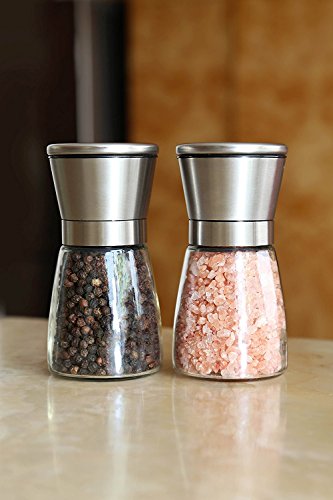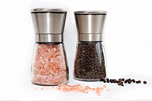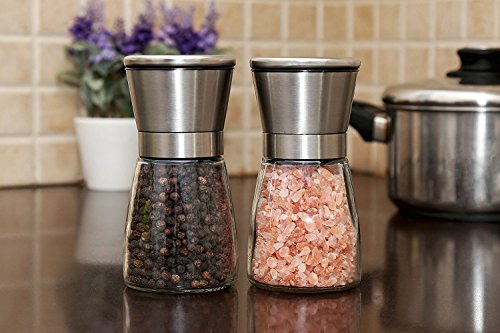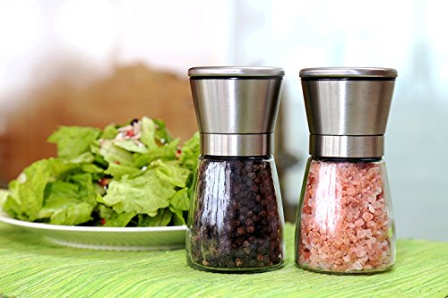 Salt and Pepper Grinder Set - Modern Stainless Steel Ring - Sphere Glass Bottle - Adjustable Coarseness with Ceramic Grinding Mechanism for Easy Seasoning Food