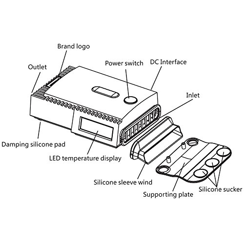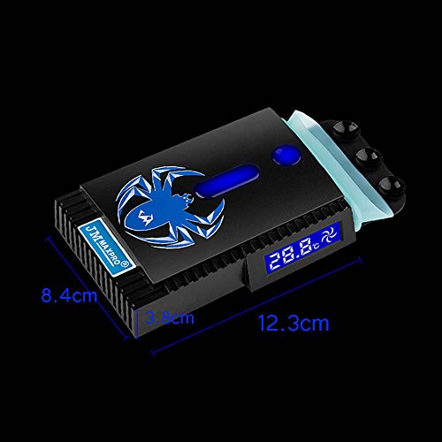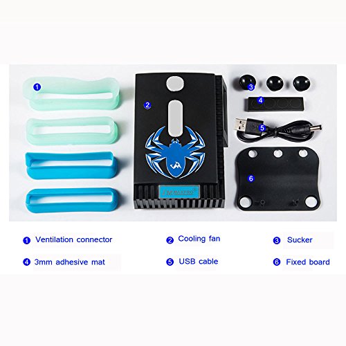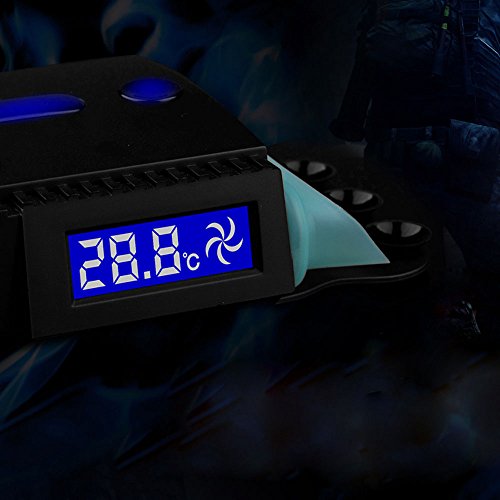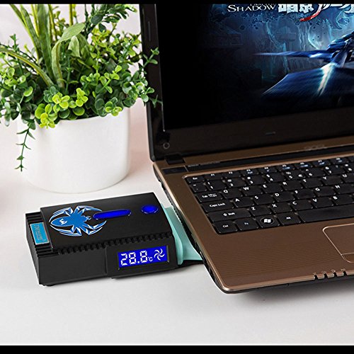 -. Feature : Intelligent temperature control and turbo fan acceleration functions. / Turbo radiator, through turbo wind pressure, extraction of the hot air out of a running system, which stabilizes the operation of the notebook and prolongs its lifetime. / LCD temperature display can show the internal airflow temperature, (Speed range: Intelligent 2000 to 4500turn +-10%, constant speed rotation speed 4500 +-10%) / Four ventilation connector, compatible with all notebook outlet. / Three super strong suction cup and bottom fixed board make it easier to fix on the laptop.