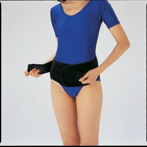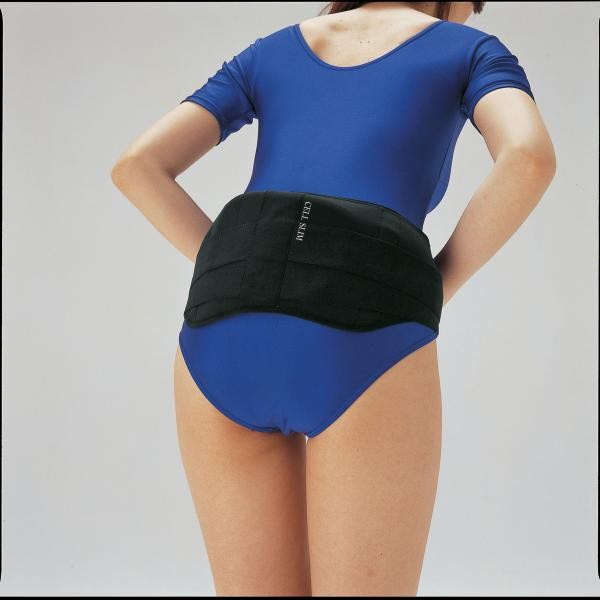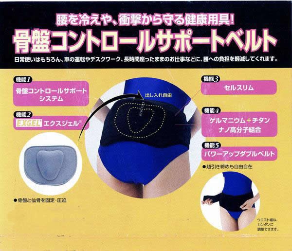 | 全体に3層構造の生地を使用。骨盤をサポートする特許品EXGEを当てがっています。マジックテープ地の本体を腰にまわし調節しながら軽くとめ。さらにダブルベルトで引きしめます。 |