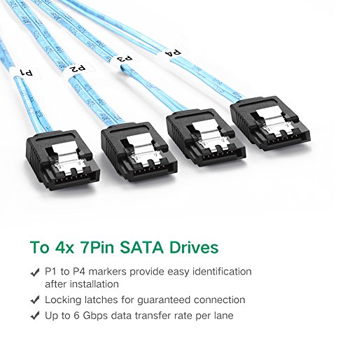 Connect Mini SAS controller to SATA Drive or SATA Backplane UGREEN Mini sas 26P SFF-8088 TO 4x SATA 7Pin Mini-SAS 26P TO 4SATA cable enables you to connect a SAS 26pin device, such as Work Station, Blade Servers, External Storage Arrays, SAS Expanders, Host Adapters (HBA'S) and RAID Controller to 4x eSATA, supporting up to 4-ports (4 lanes) of SAS data, and provideing reliable, high-performance drive and backplane connectivity. Four discrete SATA fanout drive cables are of equal length with stainless steel latches to provide a secure connection.