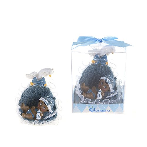 -. Title : Lunaura Baby Keepsake - Set of 12 "Boy" Black Ethnic Baby Laying in Basket with Swan Favors - Blue
