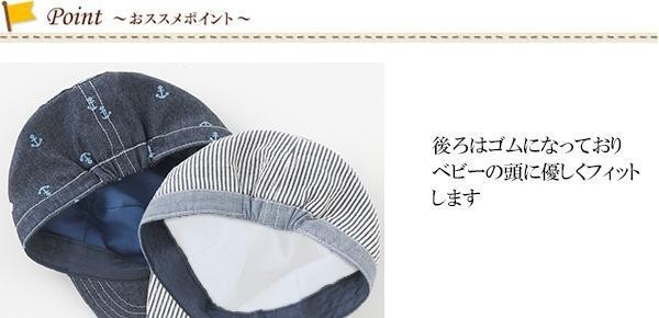 デニム生地が可愛い、キャップタイプの帽子です。後ろにゴムがあるのでベビーの頭を優しく包みます。