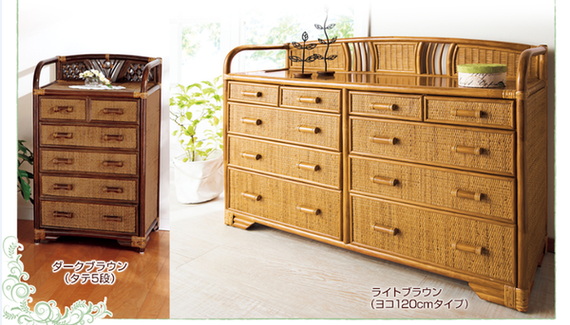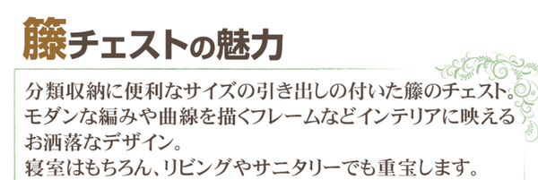 分類収納に便利なサイズの引き出しの付いた籐のチェスト。モダンな編みや曲線を描くフレームなどインテリアに映えるお洒落なデザイン。寝室はもちろん、リビングやサニタリーでも重宝します。