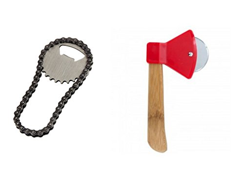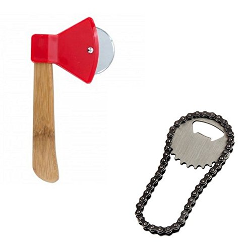 Bottle opener: Bottle opener shaped like a bike chain! Perfect gift for those that love Bottle Openers Made out of 10% stainless steel + 90% steel Flexible in one direction, stiff in the other Hand Wash Only Pizza Cutter: Axe Pizza Cutter brings the outdoors to your kitchen! Durable rotating blade makes cutting easy Comfortable bamboo handle Attention-grabbing design