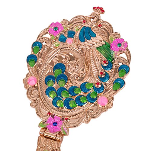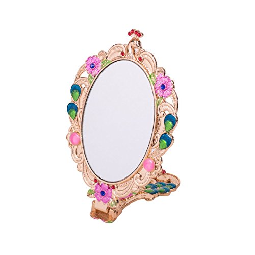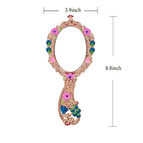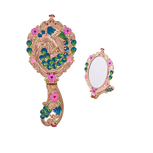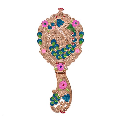 Moiom Vintage Hand Mirror, Fold-able Oval Peacock Pattern Makeup Hand/Table Mirror (Rose Gold)