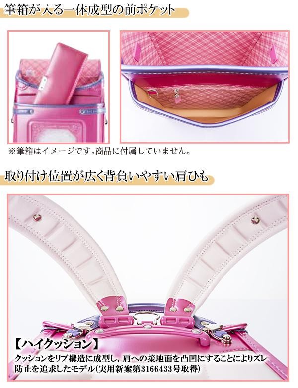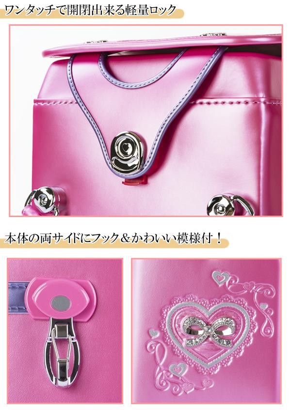 | 筆箱が入る丈夫な一体成型の前ポケットに、キラキラ光るリボン飾りやハート形の反射プリントがおしゃれなランドセルです。つややかで上品なパールカラー♪ |