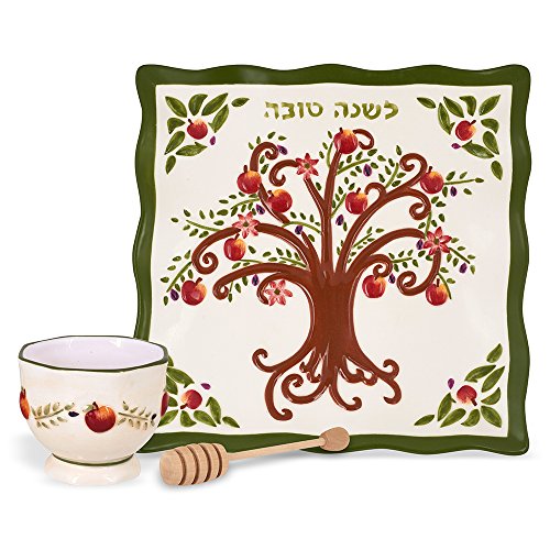 (Aviv Judaica)/Kitchen Dining/Cook's Tools Gadgets/DIRECT FROM USA/Rosh Hashanah Honey Dish - Ceramic Plate Bowl Set With Tree of Life Design, Includes Wooden Dipper