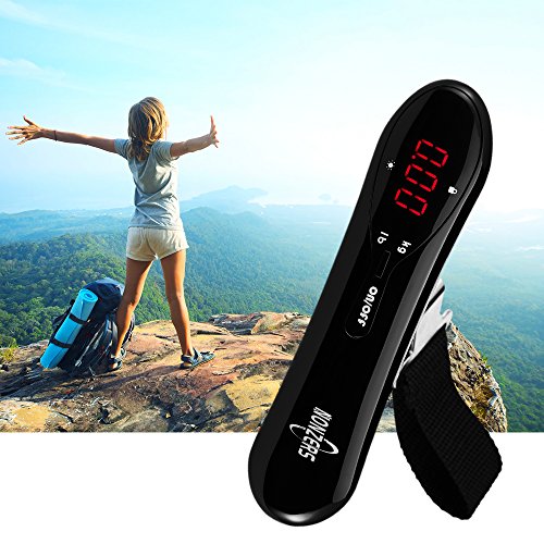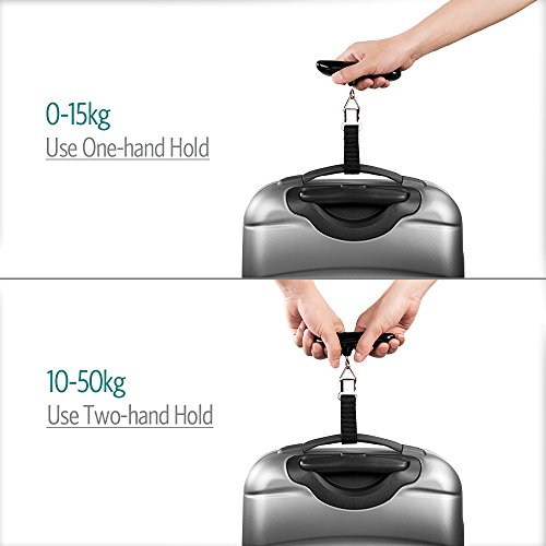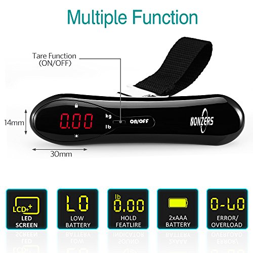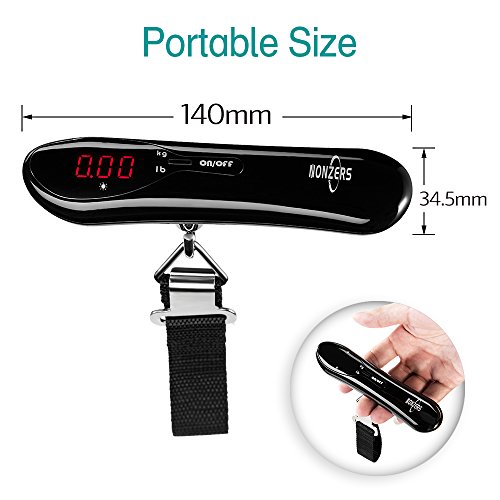 Welcome to NONZERS Shop~ We Are Committed to Provide High Quality and Durable Products. 100% Guaranteed Product Satisfaction, Customer Satisfaction is Our Highest Priority! Features: Compact and portable Light weight (only 75g) and small size allow you take it aside wherever you go. High quality and stylish design guarantee long time usage, ideal for home or travel use. Multiple functions Auto-off ,overload and low battery warning include to preserve both time and energy. Auto-off ensure that you no longer have to fret over wasted energy . Overload and low battery indicator gives you notice to ensure your scale is ready when you need it. Tare function allows you to read the net weight of your luggage easily and precisely. Intuitive back light LCD display - Easy-to- read LCD display with backlit is ready when you need it . once the reading is stable ,display locks onto weight for easy reading. Convenient unit transfer Easy to read with 2 kinds of weight units( kg , lb ) regardless of what measurement system you use Easy To Use Unravel the black luggage strap. Slip the strap through the luggage handle, then clip securely over the triangle ring. To power on, hold the power button for 2 seconds and wait for the display to read "0.00". Lift up on the scale and hold. When the loading is stable, the data will be locked and the LCD will display 'HOLD'. LCD digital display shows the weight of the goods, press the power button once auto returning to zero. When the loading is over20kg(44Ibs), the backlight of display will flash and convert between blue and red, overload indicator shows when bags are over the scale limit. Package Including: 1 * Digital Electronic Luggage Scale 2 * AAA battery 1 * User Manual 0