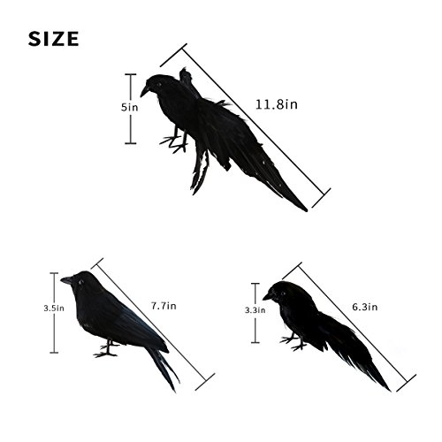-. Feature : Highly Realistic Crows Decor:made of sturdy plastic body and high quality feathers, with great workmanship. / These artificial bird pack come with 3 crow props in assorted poses- 1 flying big crow, 1 medium-size crow spreading the wing, and 1 small crow standing and raising its head. / Bendable wires on the feet allow for temporary attachment to fences, furniture, branches,fences, pumpkins, chair backs, or you can let them stay all year long to bring a sense of mystery and intrigue to your decor. / Scary Halloween and Thanksgiving Display:great for crow hunting in hunted house,placed outdoors on the porch area or in the yard,even place on the scarecrow's shoulder . / Easy to install-Take away the stick on the shoulder, fix the fly wing,enjoy the great fun of DIY.