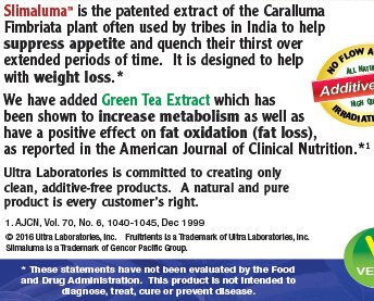 -. Binding : Health and Beauty -. Brand : Fruitrients -. EAN : 0743650001842 -. Feature : SlimalumaTM is the patented extract of the caralluma fimbriata plant often used by tribes in India to help suppress appetite and quench their thirst over extended periods of time. It is designed to help with weight loss. Green tea extract has been added to increase metabolism as well as have a positive effect on fat oxidation (fat loss). / 60 Vegetable Capsules / Gluten-Free, Vegan Formula, No Magnesium Stearate, No Additives or Fillers, No Flow Agents. / Dietary supplement FREE of milk, soy, salt, sugar, wheat, yeast, gluten, artificial flavors or preservatives. -. IsAdultProduct : 0 -. Label : Ultra Laboratories -. LegalDisclaimer : * These statements have not been evaluated by the Food & Drug Administration. These products are not intended to diagnose, treat, cure or prevent any disease. Please contact your healthcare professional immediately if you experience any unwanted side effects. The information contained herein is for informational purposes only and does not establish a doctor-patient relationship. Please be sure to consult your physician before taking this or any other product. -. Manufacturer : Ultra Laboratories -. MPN : fx00184 -. PackageQuantity : 1 -. PartNumber : fx00184 -. ProductGroup : Health and Beauty -. ProductTypeName : HEALTH_PERSONAL_CARE -. Publisher : Ultra Laboratories -. Studio : Ultra Laboratories -. Title : Fruitrients - Slimaluma - Caralluma Fimbriata + Green Tea Weight Loss Support* - 60 Vegetable Capsules -. UPC : 743650001842