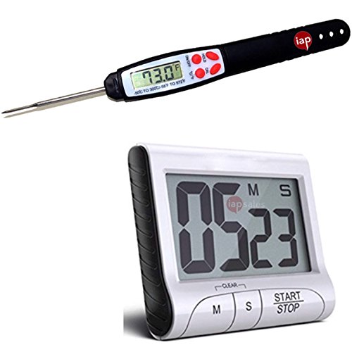 Waterproof Digital Thermometer & Digital Timer Bundle, Perfect starter set for cooking BBQ Meat, Chicken, Soups, Candy, and Baking. Simple to Use & Read Timer and Instant Read Probe Thermometer.