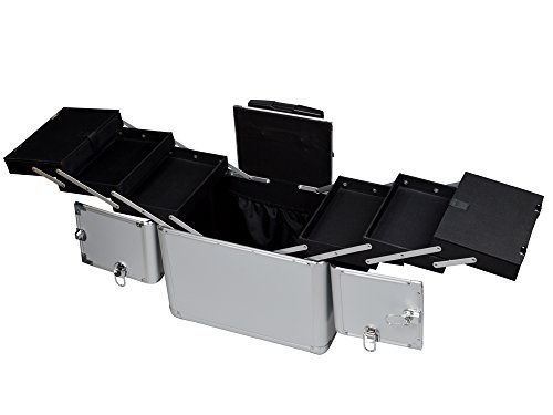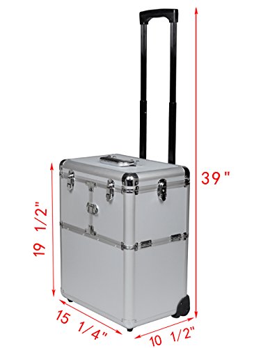Specifications: Condition: Brand New. Color: Silver. Material: Aluminum frame and ABS plastic body. Dimensions: Makeup Case Dimension: 15 1/4''L x 10 1/4''W x 19 1/2''H. Overall Dimension : 15 1/4''L x 10 1/4''W x 39''H. Bottom Compartment of Case: 15 1/4"L x 10 1/4"W x 10 1/4"H. Extendable Tray Size: 8 7/8"L x 6"W x 1 3/8"H . Telescoping Drawer Bar Height: 39"H.