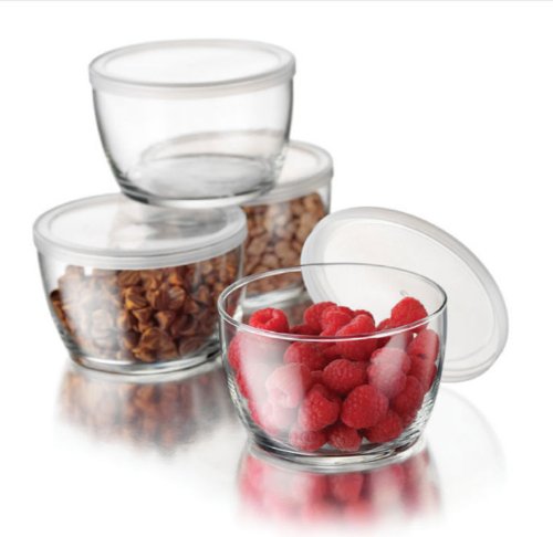 Set of twelve 16-ounce glass bowls with twelve plastic lids; measure 2 7/8-inches tall by 4 3/8-inches in diameter each