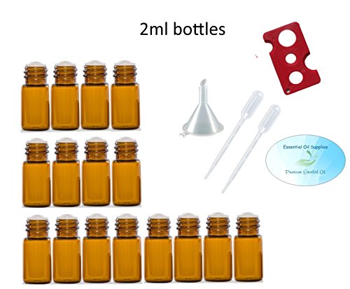 2ml (5/8 Dram) Amber Glass Bottles with Euro Orifice Reducer Tops (Pack of 16), Funnel, Pipettes, and Essential Oil Bottle Opener