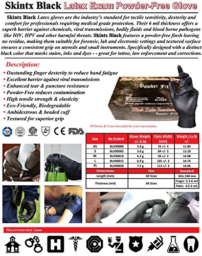Studio : Skintx Publisher : Skintx Binding : Health and Beauty Product Description Skintx BLK90000 Series Latex Medical Grade Examination Gloves are the industry’s standard for tactile sensitivity, dexterity and comfort. Its premium natural rubber latex material provides excellent protection in all risk settings, and has more stretch for greater comfort and fit. These gloves are fully textured ensuring extra protection for wet or dry grip and against slippage. As the prime choice for law enforcement, tattoo and medical professionals worldwide, PSG Skintx natural rubber latex gloves are proven to be an effective barrier protection from blood borne pathogens and microbiologically transmitted diseases. These Powder-Free gloves leave no residue, reducing the risk of contamination compared to a powdered glove, making them suitable for use in electronic components, forensic and laboratory applications. PSG Skintx Latex Gloves meet or exceed ASTM D3578, D6124, D5151, D5172 and F1671 Standards for resistance to penetration by blood borne pathogens protecting healthcare and dental professionals from HIV, HPV and other threats. Manufactured within the quality guidelines of ISO 13485:2003, ISO 9001:2008 and FDA-QSR tested for use with chemotherapy drugs. Available in Natural Cream (Skintx 90000 Series) or Powdered (Skintx 80000 Series). 0