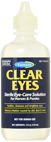 Clear Eyes is a sterile eye-care solution especially formulated for use on horses & ponies to gently flush away foreign matter and relieve eye irritation caused by dirt, dust and wind