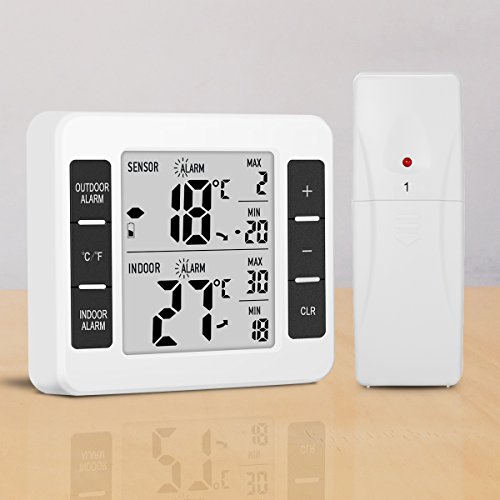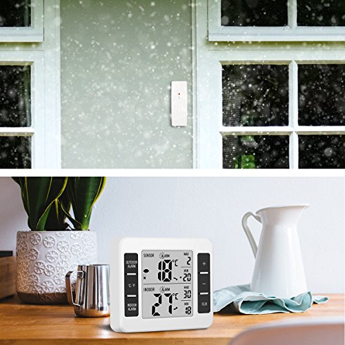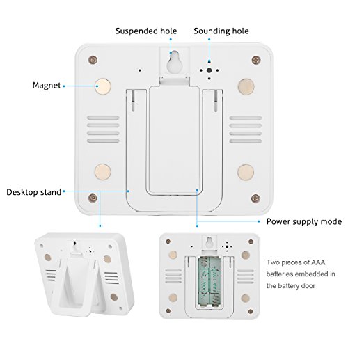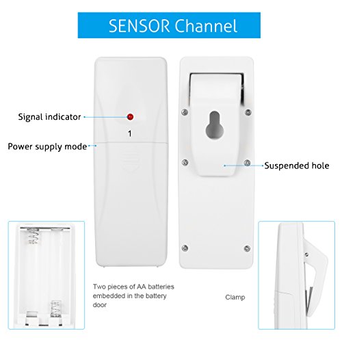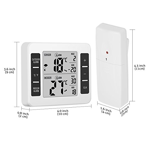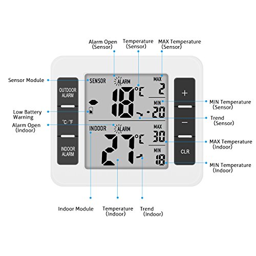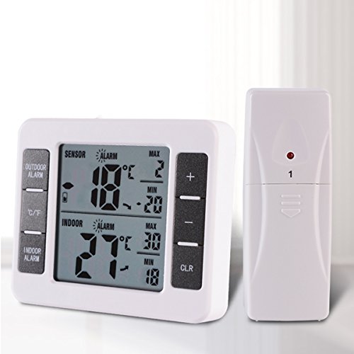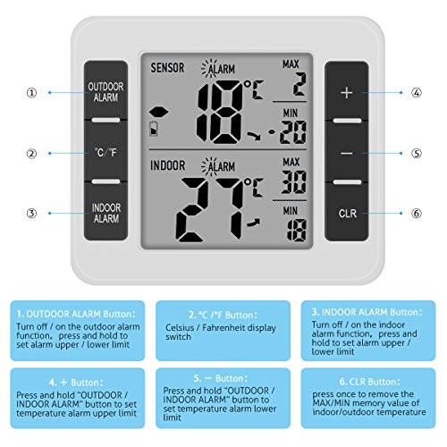 Instruction 1. Indoor and outdoor three-channel temperature and MAX / MIN records show 2. Working scope for indoor temperature test: 0 ℃ ~ 50 ℃ (32 ℉ ~ 122 ℉) 3. Temperature reception scope of doulbe outdoor channels: -40 ℃ ~ 60 ℃ (-40 ℉ ~ 140 ℉) 4. Manually clear the MAX / MIN value 5. Indoor temperature limit alarm function 6. Outdoor dual-channel temperature limit alarm function 7. RF sensor 1 and sensor 2 temperature sensor (the sensor can be placed in the refrigerator to receive the temperature inside the refrigerator) (and can set the temperature exceeds the set range shell alarm) 8. Behind the product with bracket, magnet, hanging hole 9. Use two AAA batteries (the product does NOT contain batteries) 10. The period of testing indoor temperature: 10 seconds