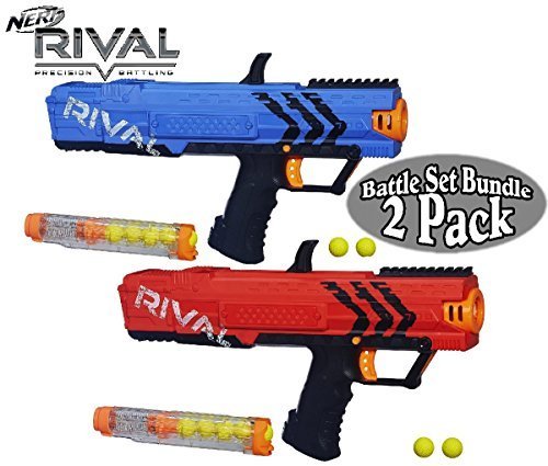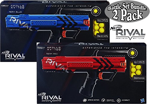 -. Feature : Battle Pack Bundle Includes 2 Nerf Rival Apollo XV-700 Blasters in Blue & Red! / Each spring-action blaster comes with 7 high-impact rounds (14 total) - Easy-load magazine holds 7 rounds / Each blaster has a trigger lock and tactical rail. / Set includes 2 blasters, 14 rounds, 2 magazines and instructions / For ages 14 and up - Add more blasters to battle as teams!