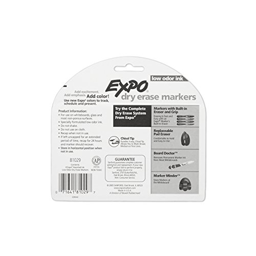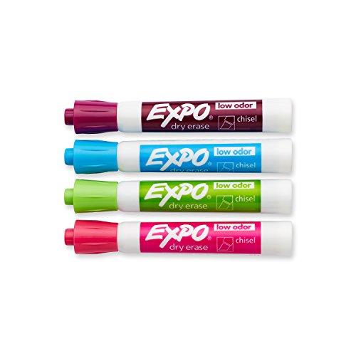 Product Description Premium dry-erase marker utilizes a special low-odor ink formula making it ideal for classrooms offices and homes. Consistent skip-free marking bold color options and great erasability make EXPO one of the most popular brands on the market. Quick-drying ink minimizes the potential for smearing. For optimal results use on nonporous surfaces such as porcelain or melamine whiteboards and glass. Marker Type: Dry Erase Assortment: Aqua Lime Pink Plum Color(s): Assorted Tip Type: Chisel. Unit of Measure : Set 0