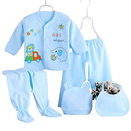 Product DescriptionFeature:Fabric: cottonSuitable for: 6-12 months babyGender:boys and girlsSize Description: Length 29cm, Bust 24.5x2cm, Sleeve Length 19cm.Package Including:1*Baby birth clothing 5 piece set 0