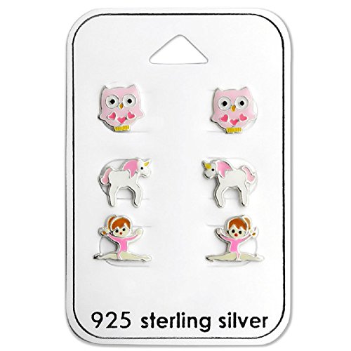 925 Sterling Silver (SET OF 3) Owl, Unicorn, Gymnast Pink Stud Earrings 28470