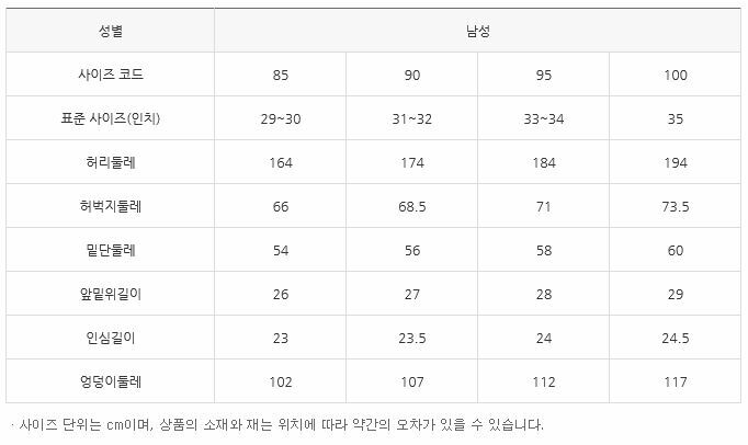 | 치수 | 실측(90)사이즈(cm)-허리둘레84 엉덩이둘레102 총장48 |