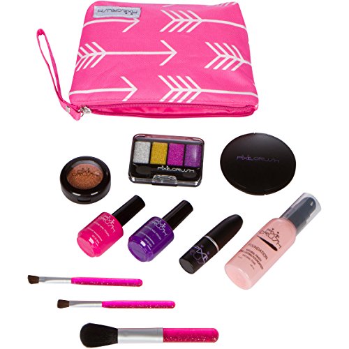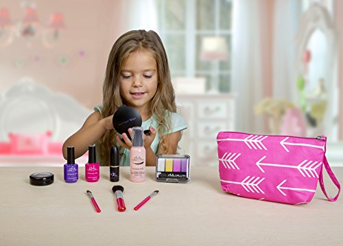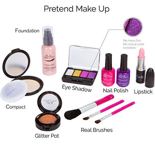 Set comes with Pink and Purple Nail Polish, Foundation Bottle, Gold Glitter Pot, Compact with Applicator, 4 Color Eye Shadow Case, Pink Lipstick (goes up and down like real lip stick), 3 Brushes and a Fashion Arrow Makeup Bag.
