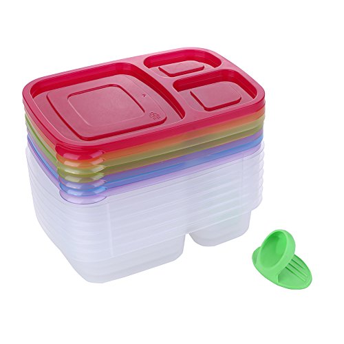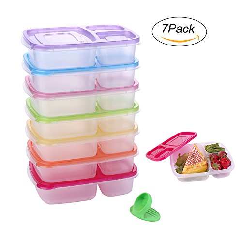 Meal prep containers: 3 Compartments; 7 Pack; 7 Multi Colored Lids ;This divided meal prep containers designed keep your food seprate.