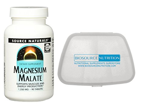 Source Naturals Magnesium Malate 1250 mg 90 Tablets in Bundle with Biosource Nutrition Pocket Pill Pack. Source Naturals Magnesium Malate is a compound of magnesium and malic acid. It supports proper muscle function, cardiovascular health, and energy production. Malic acid is a natural fruit acid that is present in most cells in the body and is an intermediate in the Krebs cycle, where energy is captured during the metabolism of carbs and fats. Magnesium is an essential cofactor for over 300 enzymatic reactions in metabolism, ATP synthesis and energy production. Magnesium plays important roles in muscle relaxation, because of its function as a cofactor for enzymes and because of its ability to counterbalance calcium in the cell.* Biosource Nutrition Pocket pill pack (5 compartments)Feature