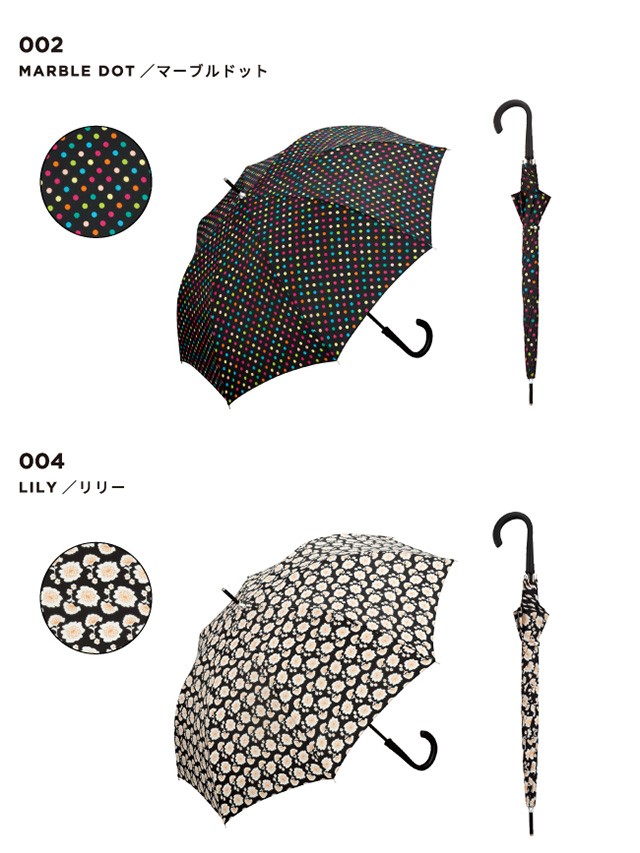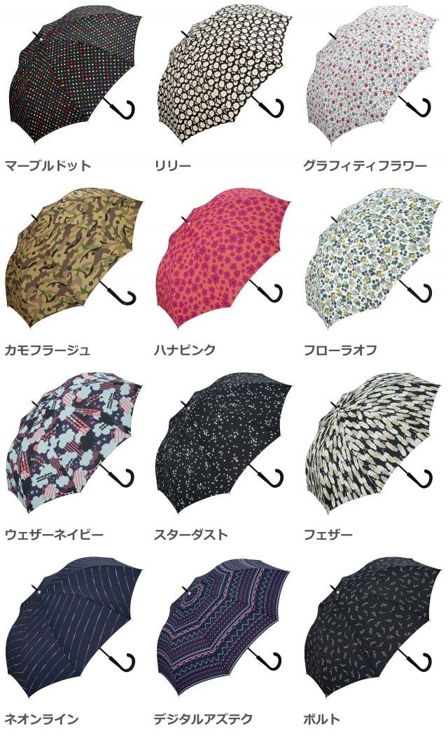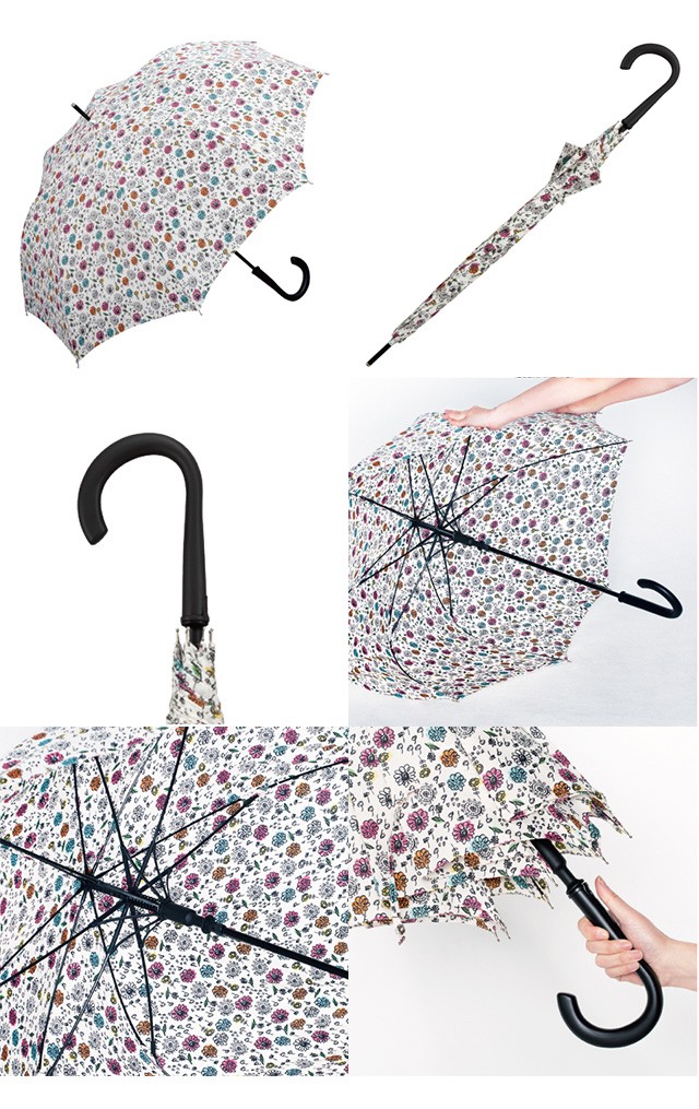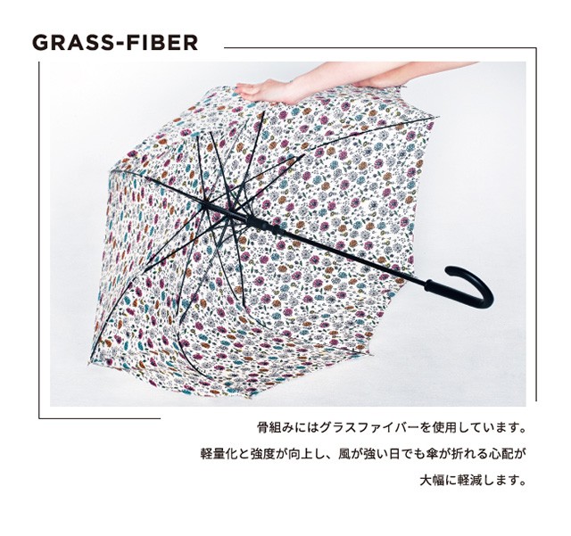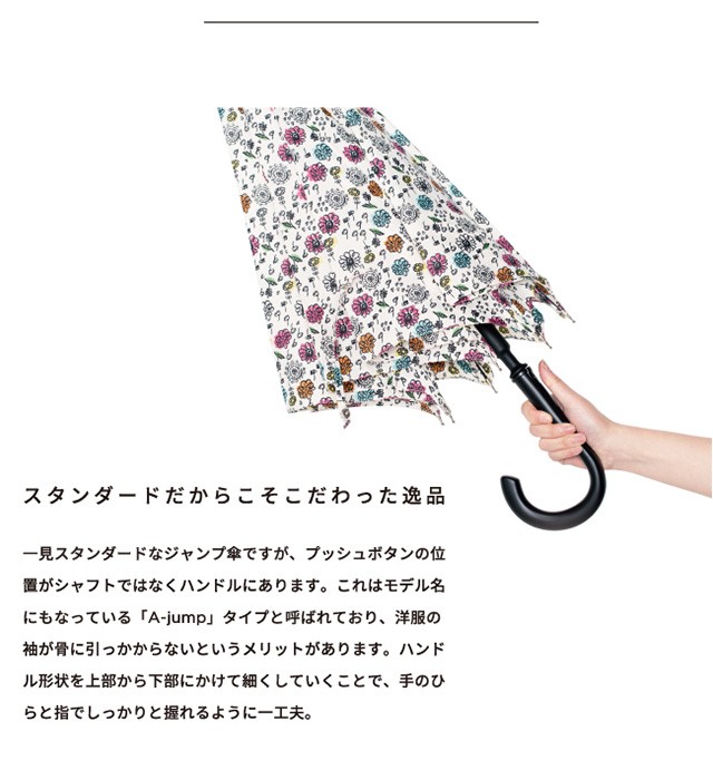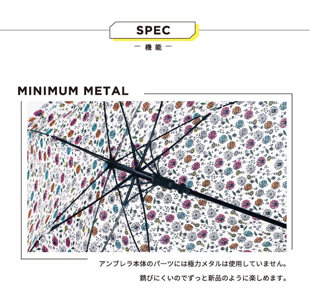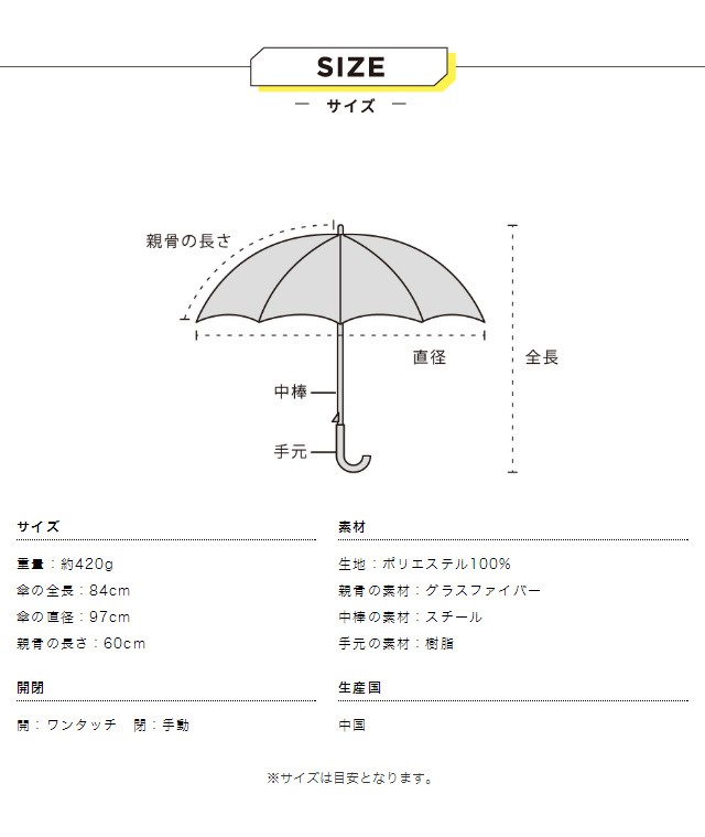 | 仕様 | 傘の重量:約420g 傘の全長:84cm 傘の直径:97cm 親骨の長さ:60cm 親骨の素材:グラスファイバー 中棒の素材:スチール 手元の素材:樹脂 開:ワンタッチ 閉:手動 | ||