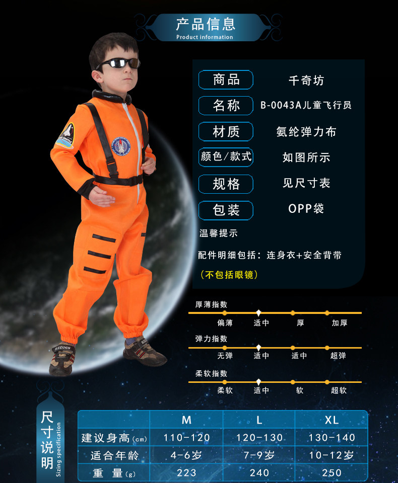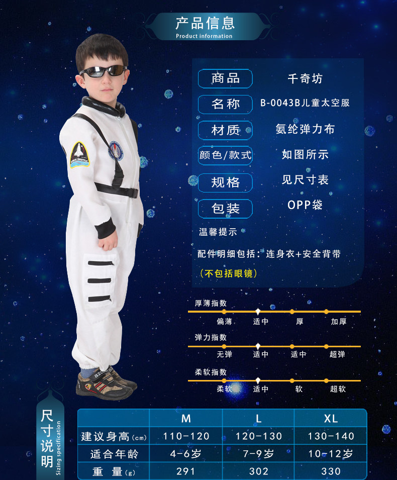 Material: Spandex fabric Size: M number, the recommended age 4-6 years old, height around 110-120cm, weight 291 g, Size: L number, the recommended age 7-9 years old, about the height 120-130cm, weight 302 g, Size: XL number, the recommended age 10-12 years old, height around 130-140cm, weight 330 g Manual measurement, there is error