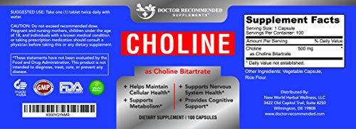 -. Binding : Health and Beauty -. Brand : Doctor Recommended -. EAN : 0689407697596 -. Feature : ONE OF THE BEST ESSENTIAL NUTRIENT that supports improvement of both long term and short term memory / VEGAN FRIENDLY SUPPLEMEN supports muscle contraction & cardiovascular efficiency / THE BEST QUALITY CHOLINE SUPPLEMENT that supports less brain fog while promoting FOCUS and ALERTNESS / COMES WITH A 100% MONEY-BACK GUARANTEE / MADE IN USA IN A STRICT GMP AND FDA CERTIFIED LAB supports good cell membranes -. IsAdultProduct : 0 -. Label : Norax Supplements -. LegalDisclaimer : These statements have not been evaluated by the Food and Drug Administration. This product is not intended to diagnose, treat, cure, or prevent any disease. -. Manufacturer : Norax Supplements -. MPN : 689407697596 -. PackageQuantity : 1 -. PartNumber : 689407697596 -. ProductGroup : Health and Beauty -. ProductTypeName : HEALTH_PERSONAL_CARE -. Publisher : Norax Supplements -. Studio : Norax Supplements -. Title : High Quality Choline - 500 mg - 100 Veggie Capsules - by Doctor Recommended Supplements - Supports Cognitive Health, Memory & More -. UPC : 689407697596